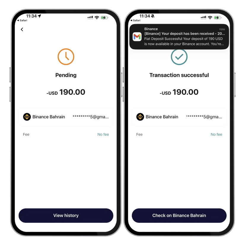 Jakmile dokončíte kroky, zobrazí se okno pro potvrzení dokončení transakce a na váš e-mail bude odeslán e-mail od Binance Bahrajn, aby potvrdil transakci vkladu 🎉.