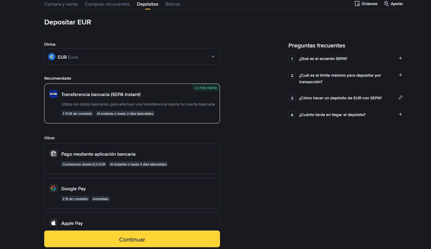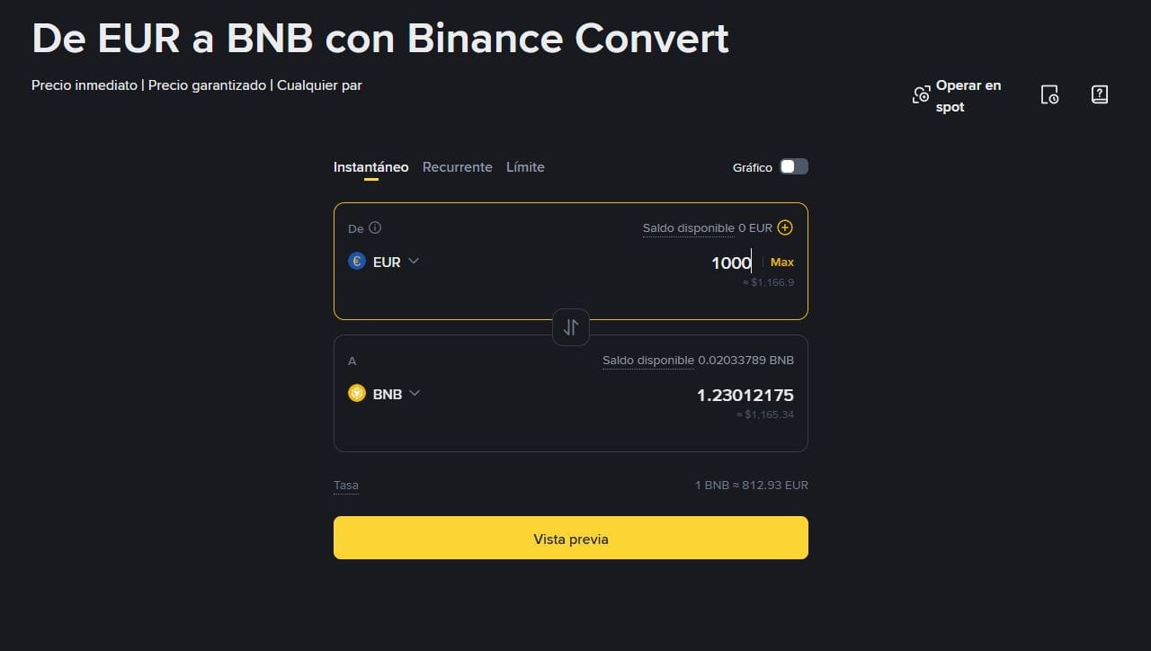 Přímý nákup v eurech (EUR): Toto je nejjednodušší možnost. Pokud má kryptoměna obchodní pár s EUR (například BNB/EUR), můžeš ji koupit přímo se svými penězi s jedním kliknutím.