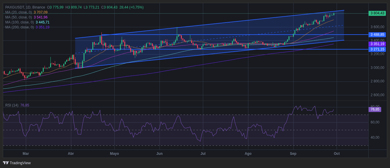 PAXG/USDT v současnosti testuje horní limit svého vzestupného kanálu, což představuje významný odpor. Cena se pohodlně pohybuje nad svými hlavními jednoduchými klouzavými průměry (SMA), což podporuje býčí strukturu.