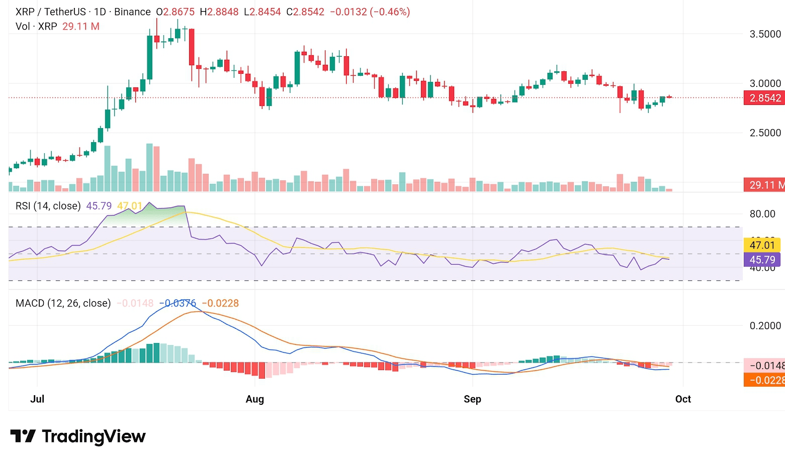 Cena XRP vykazuje první známky zotavení po poklesu na $2,70 minulý týden, stabilizovavší se těsně pod klíčovou psychologickou úrovní na $3. Podle tržních dat crypto.news vzrostl token Ripple za posledních 24 hodin o 2,6 %, což podpořil optimismus ohledně zotavení trhu jako celku a dlouho očekávaného rallye Uptober.