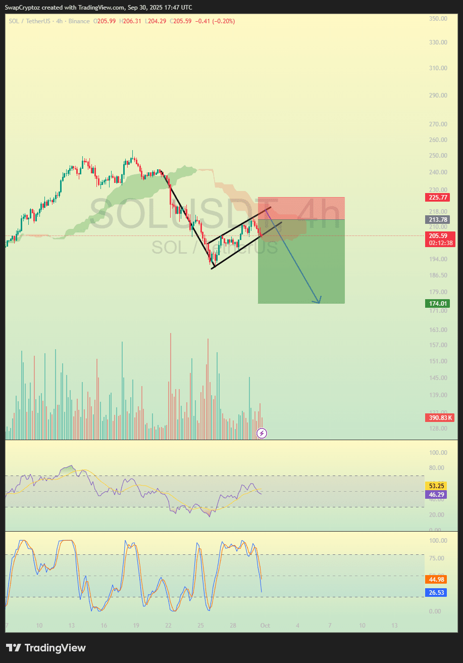 Tento graf ukazuje, že Solana (SOL) se pohybuje uvnitř vzoru medvědí vlajky po ostrém poklesu. Klín je obvykle medvědí, což znamená, že cena by mohla brzy klesnout. Pokud k tomu dojde, SOL může klesnout směrem k $174, s odporem kolem $225.