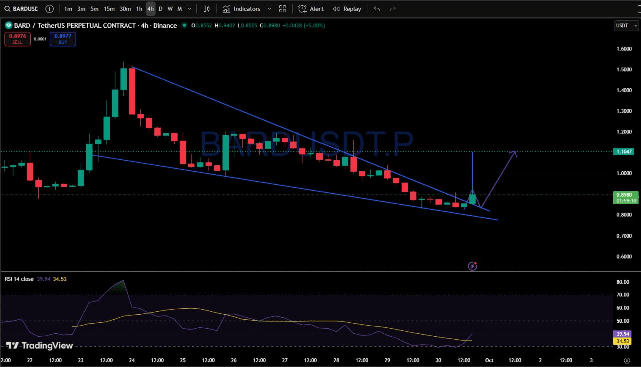 Ukazuje se, že BARD/USDT klesá už nějakou dobu uvnitř klínu, ale nyní to vypadá, že se dostává z klesajícího trendu. Pokud se pohyb udrží, cena by mohla vzrůst směrem k přibližně 1,10 $. V podstatě to ukazuje známky obratu po dlouhém poklesu.