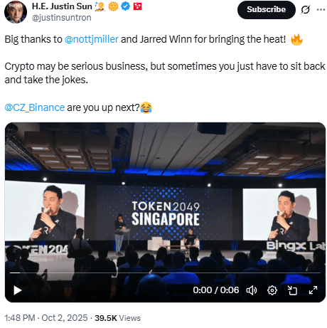 Token2049 sliboval žhavý roast kryptoprovokatéra Justina Suna – ale místo brutálních ran se publikum dočkalo 10 minut lehkého škádlení ohledně jeho výšky, právního týmu a nechvalně známého banánu za 6,2 milionu dolarů.