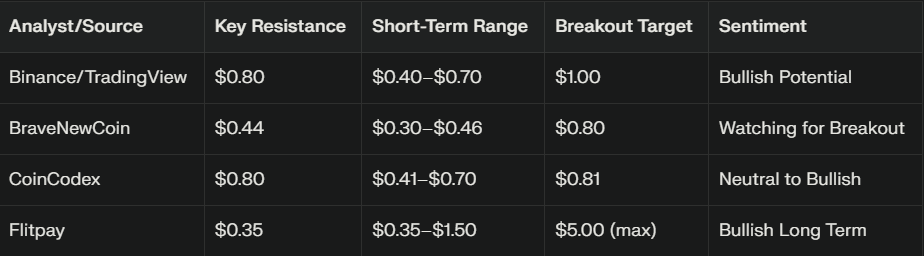 Okamžitá rezistence: Oblast $0.44–$0.50 je považována za kritickou rezistenci. Průlom této úrovně by mohl přitáhnout silné momentum a nové kupce na trh.