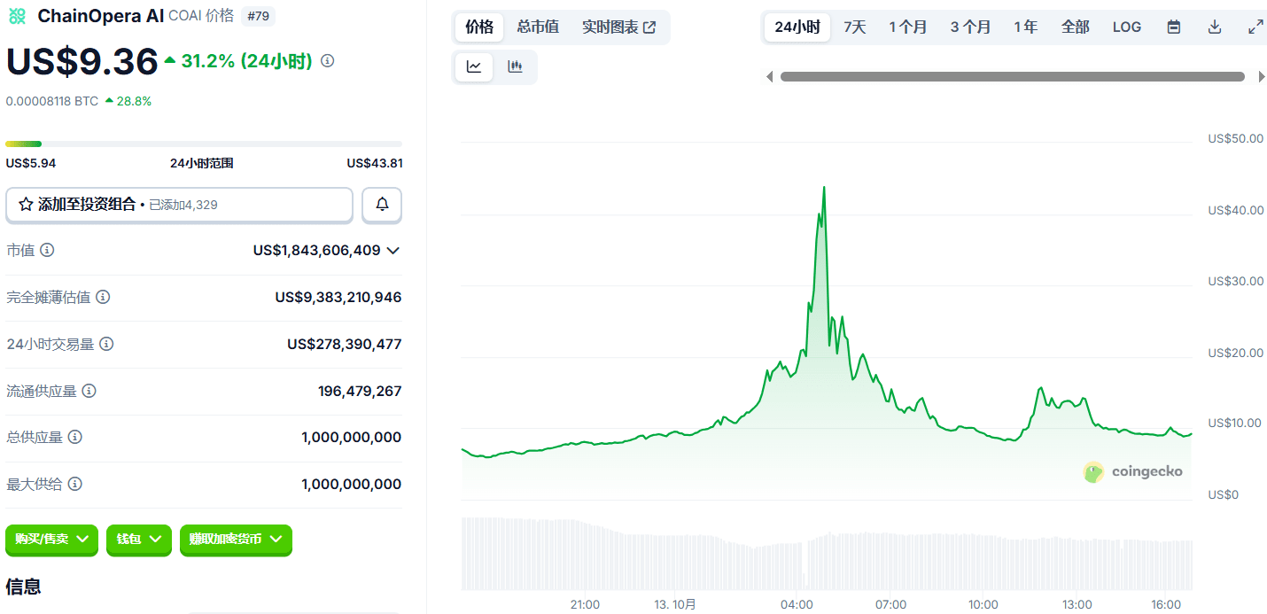 COAI tento trend je šílenější než "hazardní hry" - za 7 dní vzrostl z 3,8 dolaru na 43,8 dolaru, 10 000 korun se změnilo na 220 000! Ale nespěchejte se smíchem, hodinový graf se zasekl na 9,36 dolaru, nahoře 16,5 dolaru jako ostře nabroušený nůž visí, dole 5,94 dolaru je předchozí nízký bod "propast"!