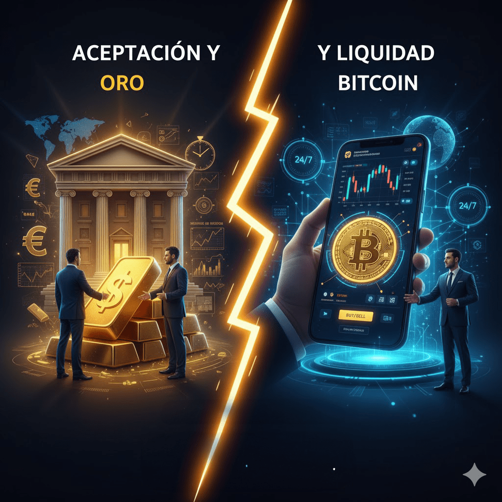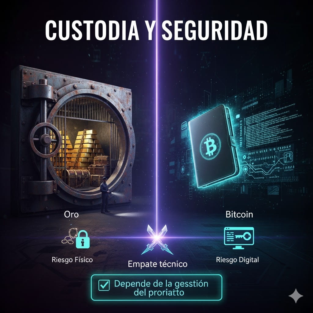⚔️ Technická remíza: Zlato má fyzické riziko; Bitcoin, digitální riziko. Bezpečnost závisí na správě vlastníka. Je velmi důležité mít střední nebo pokročilé znalosti o auto-uvedení.