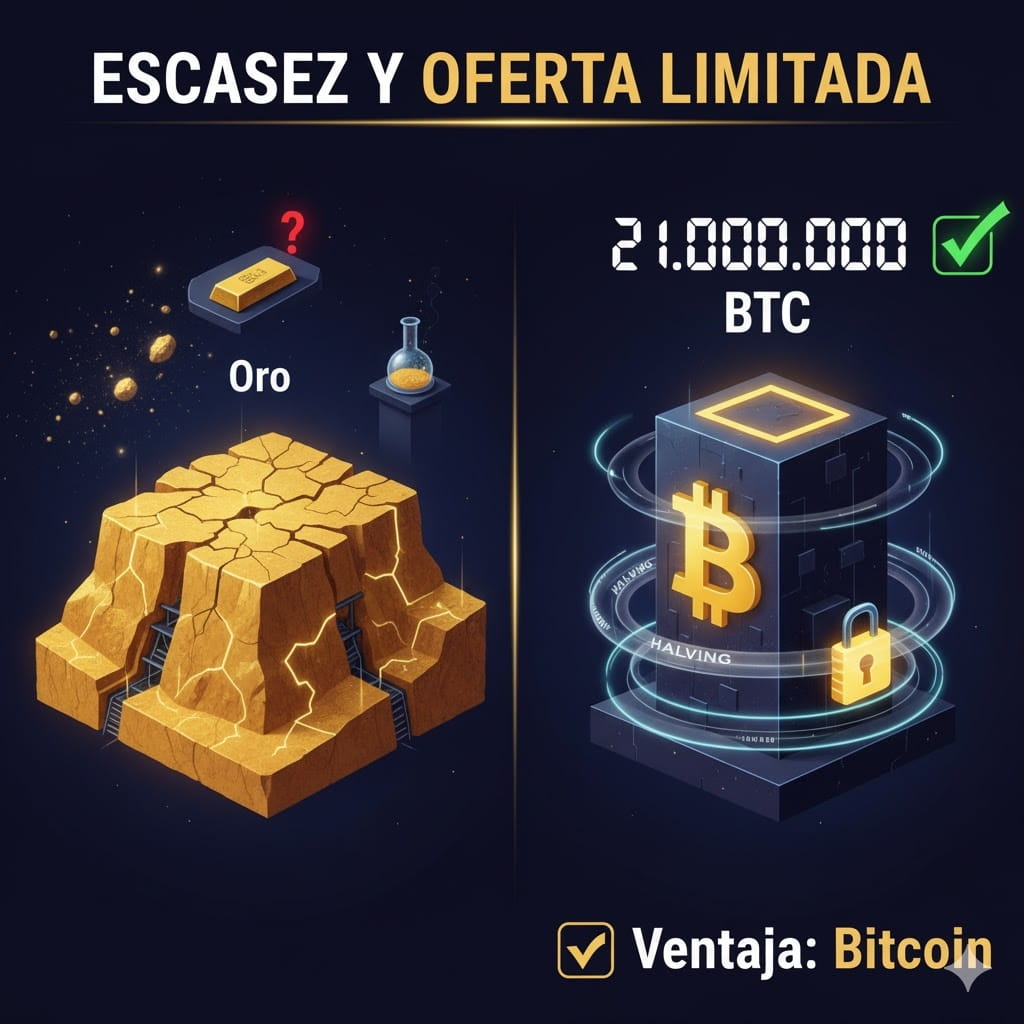 Celkové množství zlata na planetě je konečné, ale stále se objevují a těží nové rezervy. To zpomaluje růst jeho nabídky v čase, i když kontrolovaně. Nedostatek zlata je mnohem méně spolehlivý než nedostatek Bitcoinu, protože by se mohlo uměle vytvořit zlato, objevit nové ložiska a dokonce existují asteroidy s velkým množstvím zlata ve vesmíru.