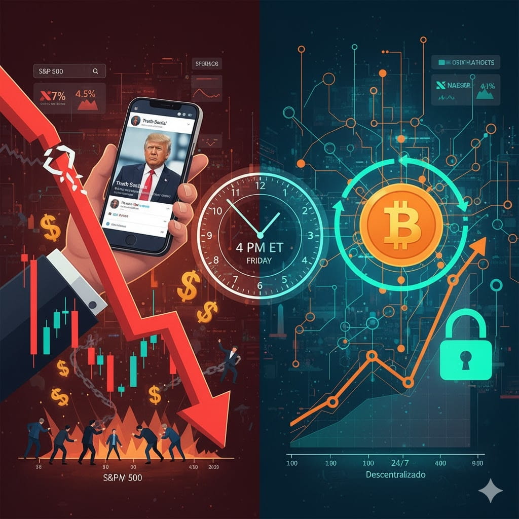 Trump ví velmi dobře, že pátky, kdy se burzy zavírají, jsou jedním z nejlepších okamžiků pro spuštění tohoto typu manipulací, protože většina investorů už je o víkendu a navíc jim nedává ani sekundu na reakci: těsně po 16:00 (ET) 10. října jeho příspěvek na Truth Social o 100% tarifu na Čínu kvůli omezením v oblasti vzácných kovů smazal 2 biliony dolarů z akciového trhu za jeden den, což prakticky zanechalo tradery v trenkách, přičemž S&P 500 klesl o 2,7 % a Nasdaq o 3,6 %. Něco, co se s Bitcoinem nestává, protože kromě toho, že je decentralizovaný a nezávislý na vládě, můžete s ním obchodovat 365 dní v roce, 24 hodin denně.