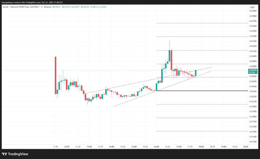 se v současnosti obchoduje kolem 0.0272 a konsoliduje se v rostoucím klínu. Klíčový odpor leží mezi 0.0285–0.0290, zatímco 0.0240 slouží jako hlavní podpora. Průlom s vyšším objemem by mohl cílit na zónu 0.031–0.033, ale pokles může vyvolat návrat k 0.024.