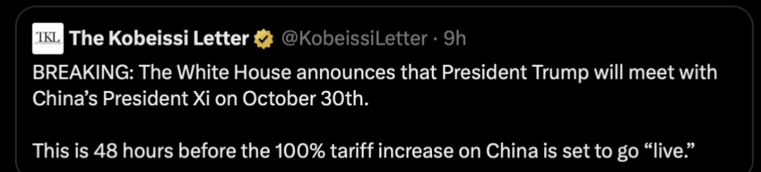 Trumpova reakce? … 100% cla na zboží v hodnotě přes 500 miliard dolarů z Číny. Účinné od 1. listopadu. Den po jejich schůzce.