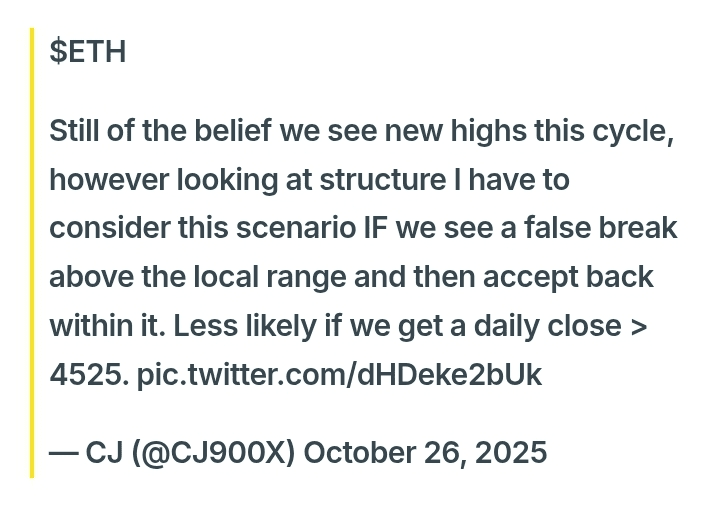 CJ, populární komentátor kryptoměn na X, se ukázal být optimistický ohledně toho, že ETH dosáhne nových maxim, tedy nad 5.000 dolarů v tomto cyklu, ale varoval před falešným medvědím proražením, pokud nedojde k dennímu uzavření nad 4.525 dolarů.