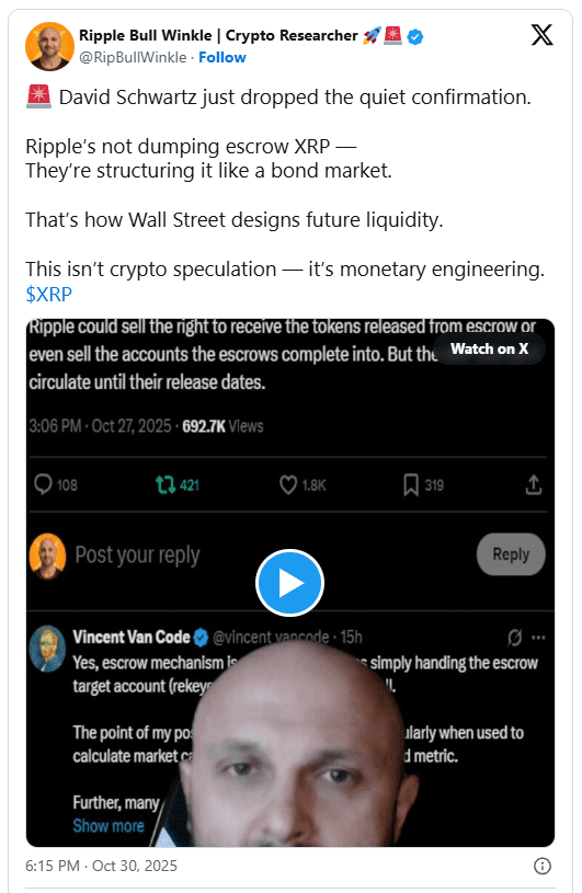 👉Od kryptografických prodejů k inženýrské likviditě 🧠 Ripple Bull Winkle tuto transformaci stručně vysvětlil slovy: „Tomu se neříká výprodej. Tomu se říká inženýrská likvidita.“ 💡 Jeho komentáře naznačují, že zajištění Ripple by mohlo pomoci vytvářet strukturovanou likviditu, aniž by zaplavilo trh okamžitou nabídkou. 💧 Při navrhování kontraktů spojených s budoucími vydáními by Ripple mohl umožnit institucím koupit předvídatelnou expozici budoucí likviditě, aniž by dnes zvyšoval $XRP v oběhu. 🏦 To odráží, jak fungují trhy s dluhopisy 📊, kde se hodnota obchoduje na základě očekávaných plateb místo aktuální hotovosti.