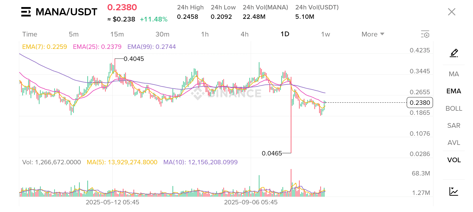Tento graf je denní (1D) graf pro obchodní pár #MANA/USDT , pravděpodobně z Binance, ukazující cenovou akci a klouzavé průměry za několik měsíců v roce 2025.
