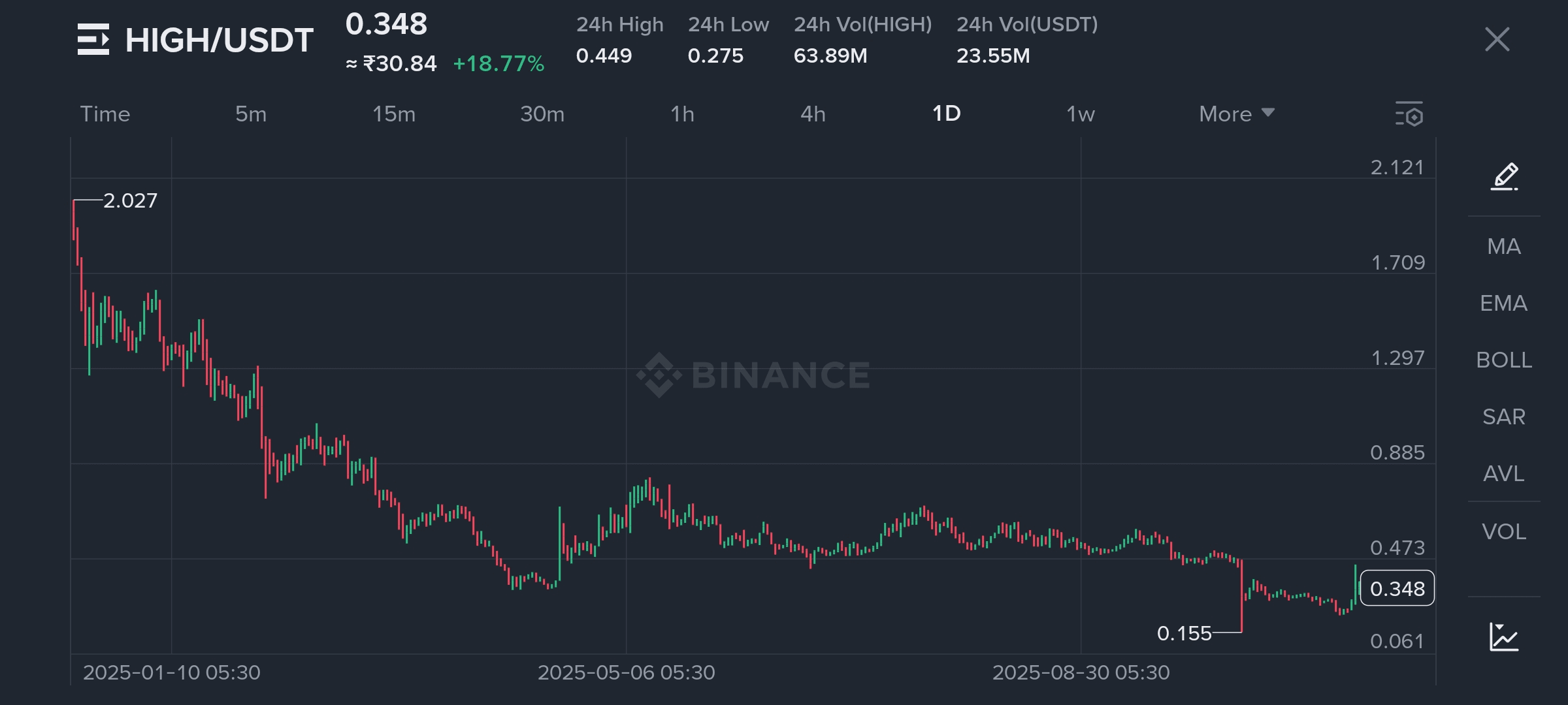 Pokud máte trpělivost v sobě, můžete vydělat peníze pomocí kryptoměn, protože hraje velmi důležitou roli v dnešní době, ale podmínkou je, že musíte mít výběr nejlepší mince. V tomto článku vám vysvětlím minci, která může přinést zisk přibližně 200x. Název této mince je $HIGH aktuální pozice této altcoiny vám ukážu na obrázku níže👇