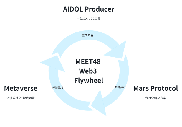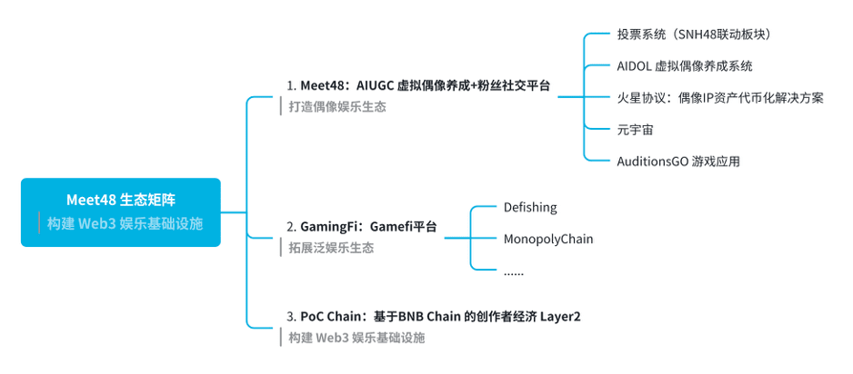 3. Na úrovni toku, MEET48 v počáteční fázi přenese hlasovací mechanismus SNH48 na blockchain, aby vnesla raný tok do platformy AIUGC; uvádí na trh Web3 virtuální idol hru (AuditionsGO) a spolupracuje s Tencent Video na vytvoření prvního globálního AI Idol soutěžního programu, který pomůže produktům překonat hranice a vstoupit do hlavního proudu.
