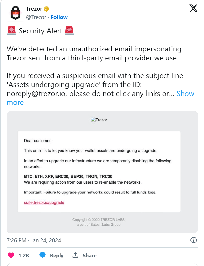 Dne 24. ledna #Trezor vydala prohlášení, v němž odhalila, že identifikovali neautorizovaný e-mail, který nepravdivě tvrdil, že je od společnosti, šířený e-mailovou službou třetí strany, kterou používají.