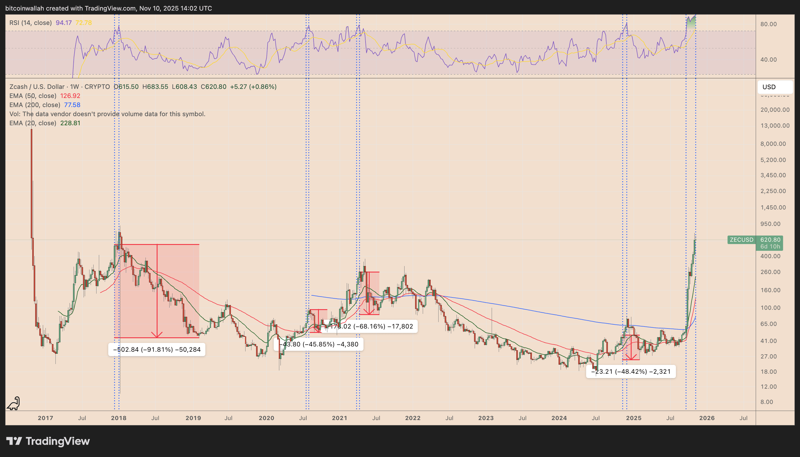 Historicky cena ZEC může několik týdnů růst poté, co se dostane do přeprodané zóny nad 70, po čemž obvykle následují ostré korekce trvající několik měsíců, které se pohybují mezi 45 % a více než 90 %.
