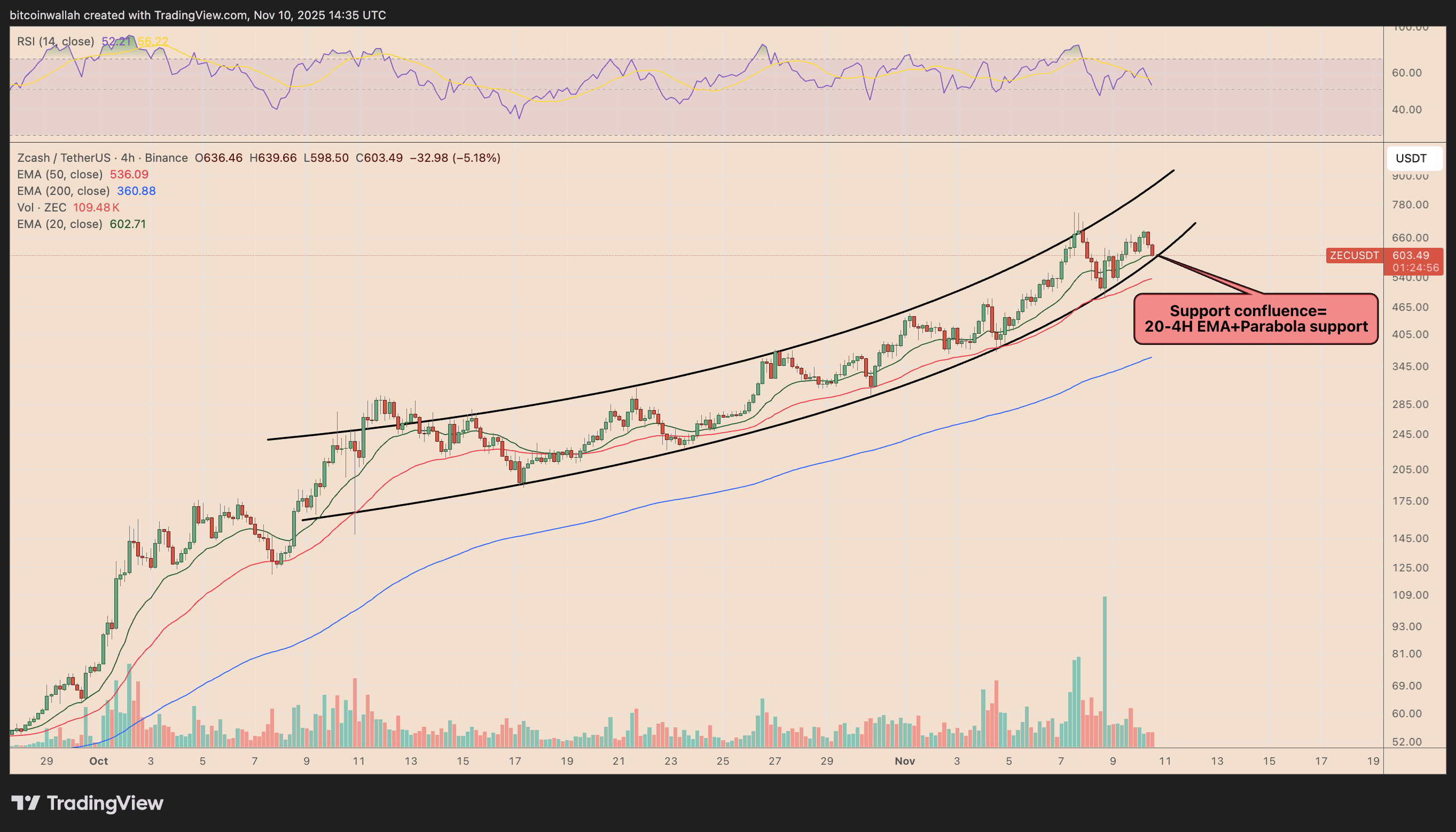 V letech 2021-2022 se ZEC propadl o více než 95 % poté, co zaznamenal relativně méně závažný signál. Předchozí korekce z přeprodanosti na týdenním grafu naznačují, že cena ZEC se blíží k jejímu exponenciálnímu klouzavému průměru za 20 týdnů (EMA za 20 týdnů, zobrazená zelenou vlnou). K dnešnímu dni se vlna EMA pohybuje kolem 230 USD, téměř 62 % pod aktuálními cenami. Na čtyřhodinovém grafu se ZEC nachází v rámci strmého parabolického kanálu a v současnosti testuje klíčovou podporu tvořenou EMA za 20 týdnů a dolní parabolickou trendovou linií.