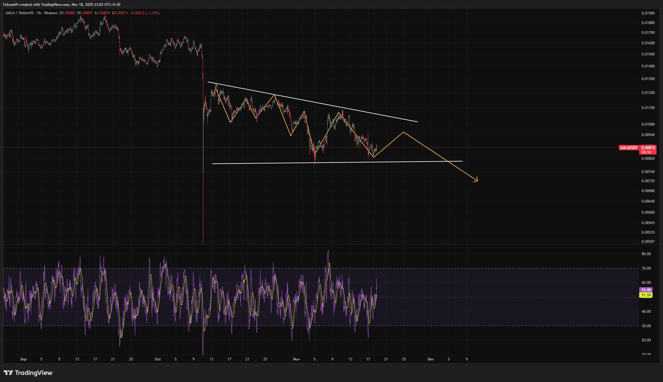 Vidím klesající trojúhelník 📐 vzor Tento vzor má nižší maxima tlačená proti silné horizontální úrovni podpory poblíž $0.0089. To je obvykle medvědí pokračovací vzor ⬇️. Cena je aktuálně poblíž úrovně podpory. Projekovaná cesta (oranžová šipka) naznačuje pohyb nahoru k opětovnému testování klesající rezistence před rozpadnutím 💥 pod $0.0089 s cílem na $0.0080 are