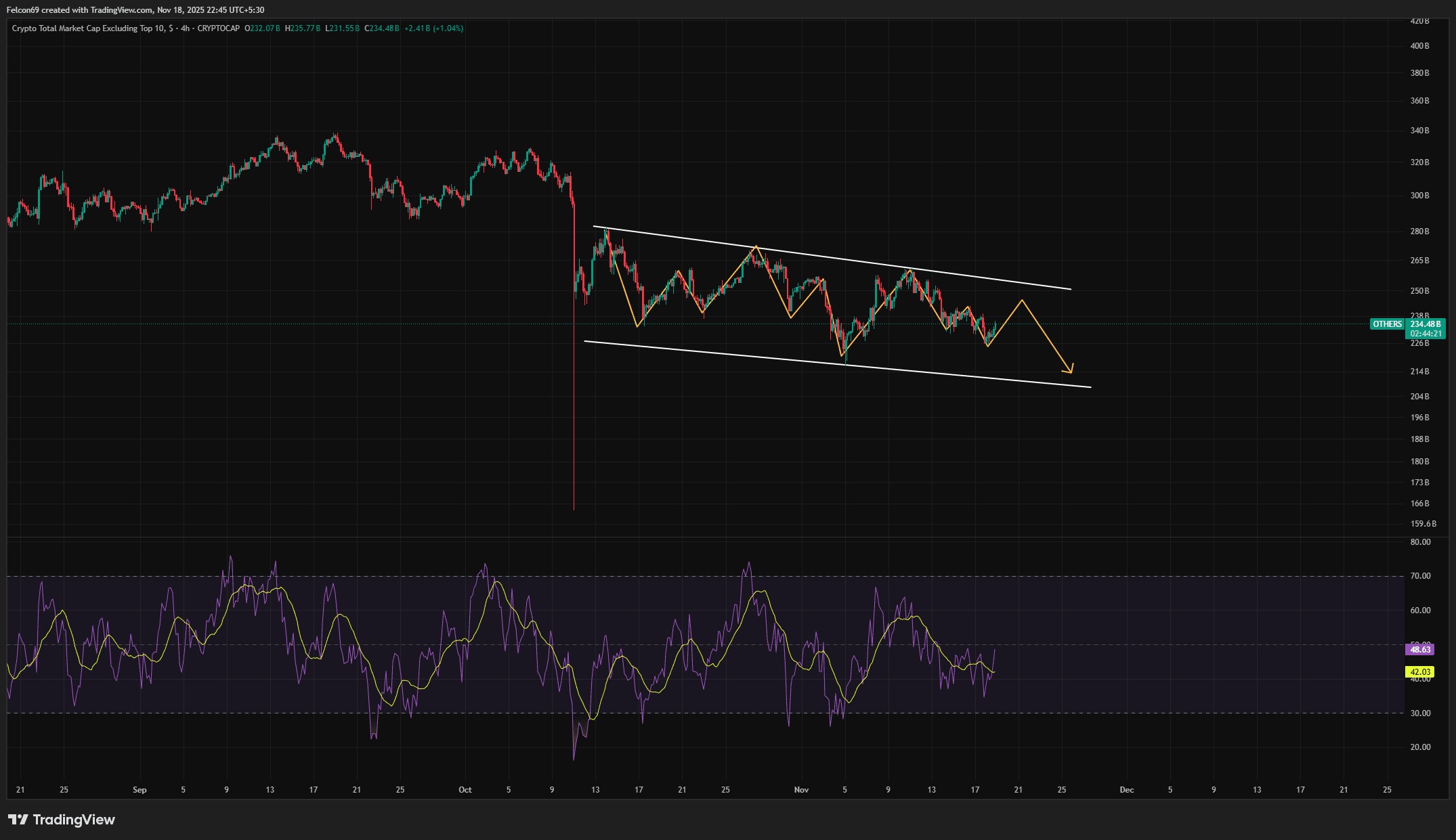 Vidím, že na OTHERS.D se tvoří sestupný kanál 🔽, definovaný dvěma rovnoběžnými sestupnými bílými trendovými čarami. Toto často představuje vývojový prapor nebo převratový vzor. Cena je nyní blízko středu. Pohyb dolů k dolní hranici kolem 210B může předcházet silnému návratu a nakonec breakoutu 🚀 nad horní čáru.