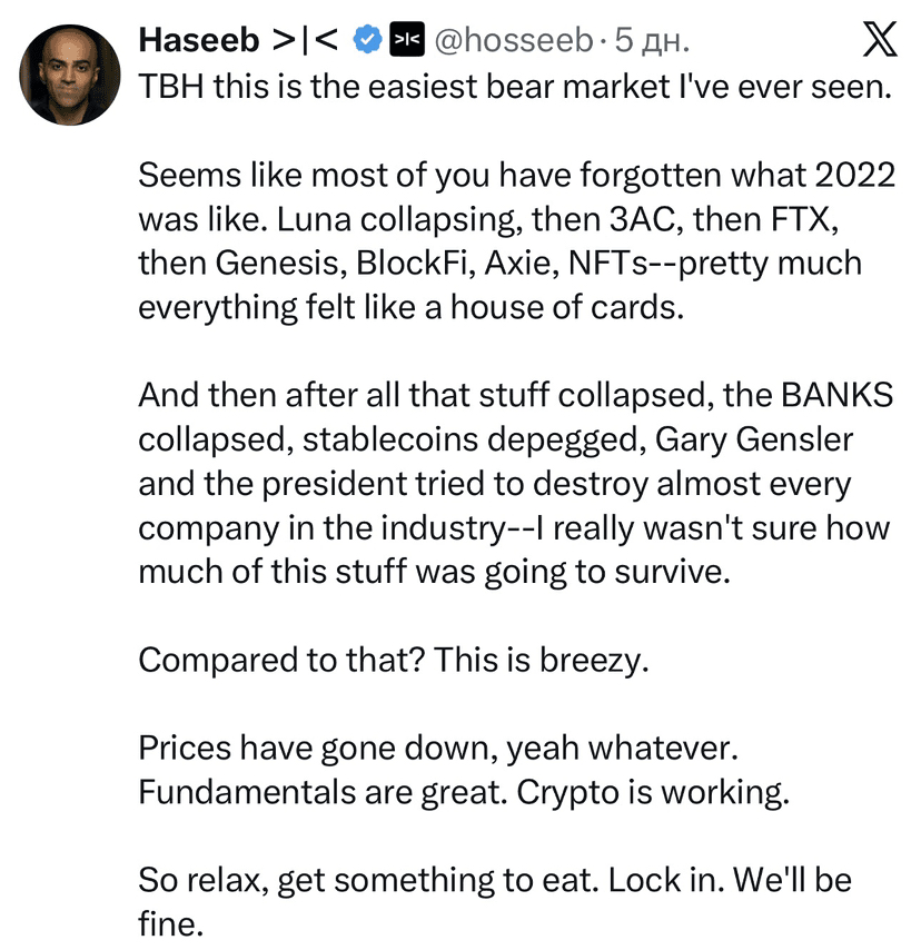 Podle slov Hasiba (managing partnera Dragonfly) se současná vlna výprodejů na kryptoměnovém trhu liší od „extrémního medvědího“ roku 2022 — tehdy pokles provázely kolapsy Luna, 3AC, FTX, Genesis a problémy v oblasti bankovní infrastruktury. Hasib zdůrazňuje:
