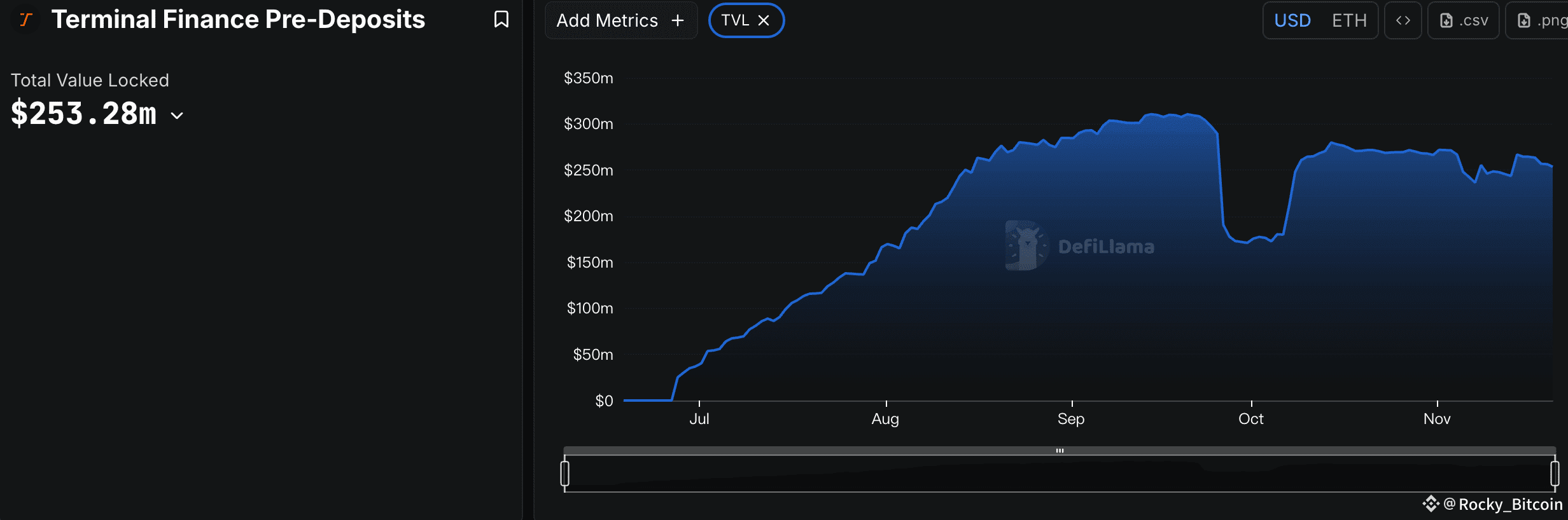 我第一眼看到它的数据时,确实有点坐不住了。首先,这哥们还没正式开业就干到了超3亿美金锁仓,直接刷新了DEX预热记录。怎么做到的?它搞了三个"VIP理财池",让大家提前存钱占座:2.25亿USDe(Ethena的合成美元)、1万枚ETH和100枚BTC。现在这三个池子全被抢爆了,活脱脱币圈"网红店开业排队"现场。更狠的是,参与预存的1万多个钱包地址,后续都能领空投糖果,这波用户绑定玩得贼溜。并且预计 #Terminal DEX 将于今年12月上线,这一波空投必然是大肉!