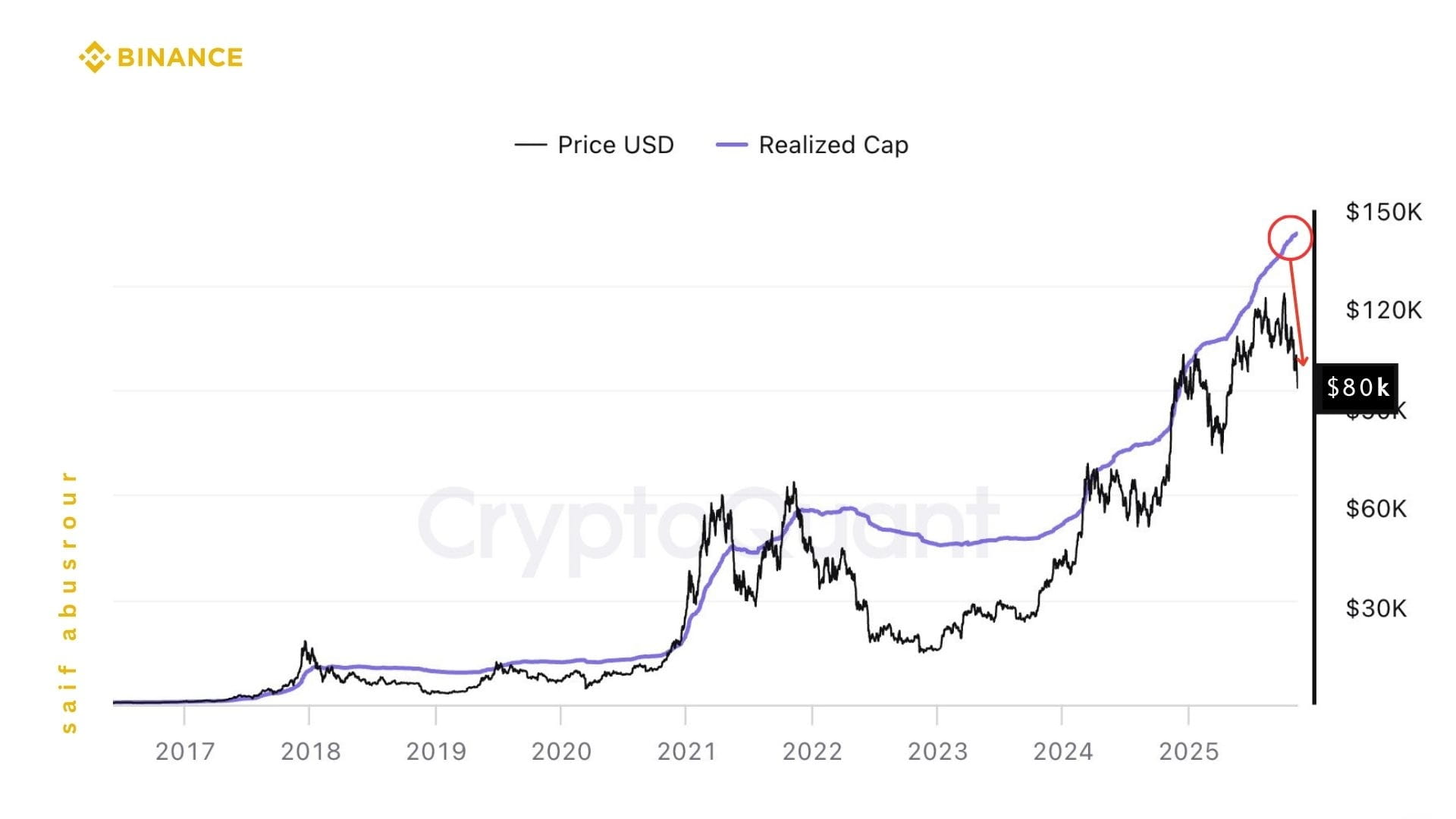 Základní myšlenka v tomto grafu je, že fialová linie nezobrazuje okamžitou cenu, ale "kumulativní náklady na trhu." Každý Bitcoin, který se pohybuje na řetězci, má poslední cenu, kterou za něj někdo zaplatil; když sečteme tyto náklady pro všechny mince, dostaneme to, čemu se říká realizovaná kapitalizace (Realized Cap). Vizuálně v grafu vidíte, že tato linie pokračuje v téměř nepřetržitém vzestupu, i když prochází nad oblastí 150 tisíc na měřítku grafu, zatímco samotná cena prorazí nahoru a poté klesne na 82 tisíc. Tento rozdíl mezi pohybem ceny a pohybem realizované hodnoty je klíčový: cena odráží náladu okamžiku, zatímco realizovaná hodnota odráží, kde se skutečný kapitál soustřeďuje, a která vrstva investorů přebírá štafetu v této fázi cyklu.