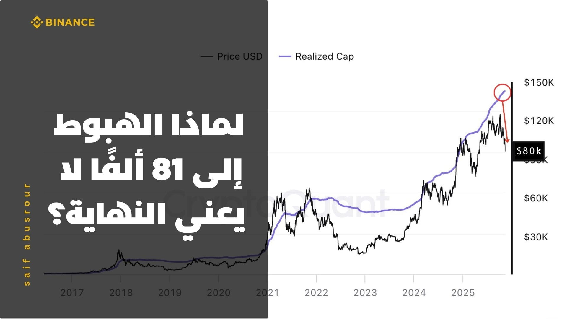 Skrytá myšlenka, kterou si 99 % obchodníků neuvědomuje, je, že skutečná otázka není: "O kolik Bitcoin klesl z vrcholu?" Ale: "Začala se křivka realizované hodnoty smršťovat, nebo se stále rozšiřuje?" Poměr poklesu z vrcholu může klamat; můžete vidět pokles o 30–40 % uprostřed vzestupného cyklu, a můžete vidět stejný poměr na začátku dlouhé zimy. Rozdíl je v tom, že skutečná zima přichází, když začne čistý kapitál opouštět síť, a fialová hodnota se změní v horizontální nebo klesající dráhu; dokud linie v grafu, který máte, pokračuje v růstu směrem k oblasti 150 tisíc na měřítku grafu, zatímco dočasná cena je pod ní na 82 tisících, pravděpodobně čelíte tvrdé fázi téhož cyklu, nikoli zcela novému filmu.