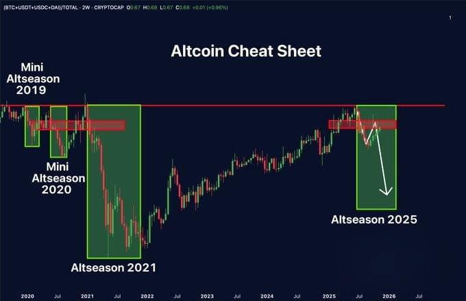 Nyní se podívejte, kde jsme dnes. Současný graf ukazuje stejnou formaci: mini altseason dříve v roce 2025, odmítnutí na kritické horizontální rezistenci, a nyní - komprese. Trh se svírá. Volatilita se zpevňuje. A pokud je historie jakýmikoli vodítkem, co přijde dál, by mohlo být hlavní událostí.