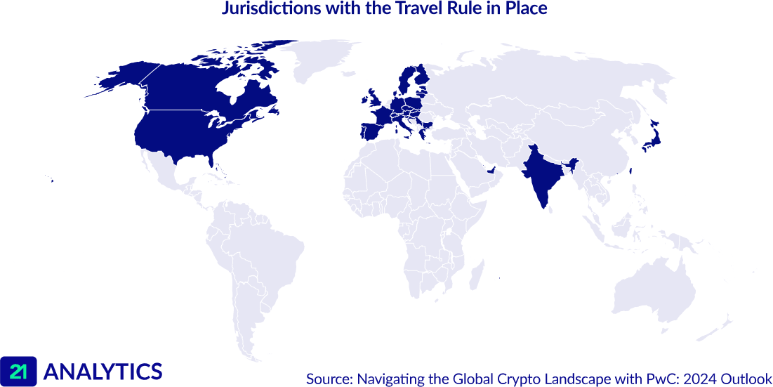 Regiony, jako je EU, počínaje 30. prosincem 2024, USA, Kanada a Singapur přijaly pravidlo o cestování pro kryptotransakce. I když to podporuje legitimitu trhu, dodržování může být nákladné a časově náročné, zejména pro menší podniky. Splnění regulačních požadavků často vyžaduje značné investice do technologií a personálu, což může ztížit růst a inovace v kryptoprůmyslu.