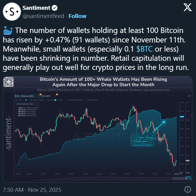 Na pozadí poklesu ceny velcí hráči zvyšují pozice. Podle údajů Santiment od 11. listopadu vzrostl počet peněženek s balancem od 100 BTC o 91 adres.