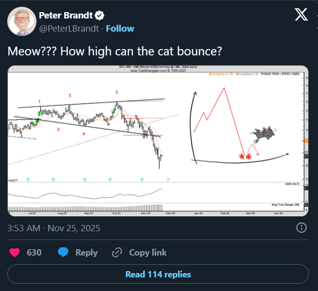 Nicméně ne všichni účastníci trhu jsou naladěni optimisticky. Trader Peter Brandt charakterizoval současné zotavení cen jako "odskok mrtvé kočky" v rámci širšího klesajícího trendu.