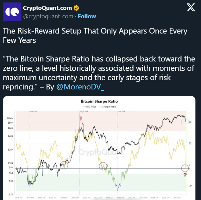 Koeficient Sharpa poprvé od června loňského roku klesl do záporné zóny. Analytik pod přezdívkou MorenoDV poznamenal, že podobná struktura trhu byla pozorována v letech 2019, 2020 a 2022. V těchto obdobích se indikátor dlouho nacházel na nízkých úrovních před formováním mnohaměsíčních vzestupných trendů.