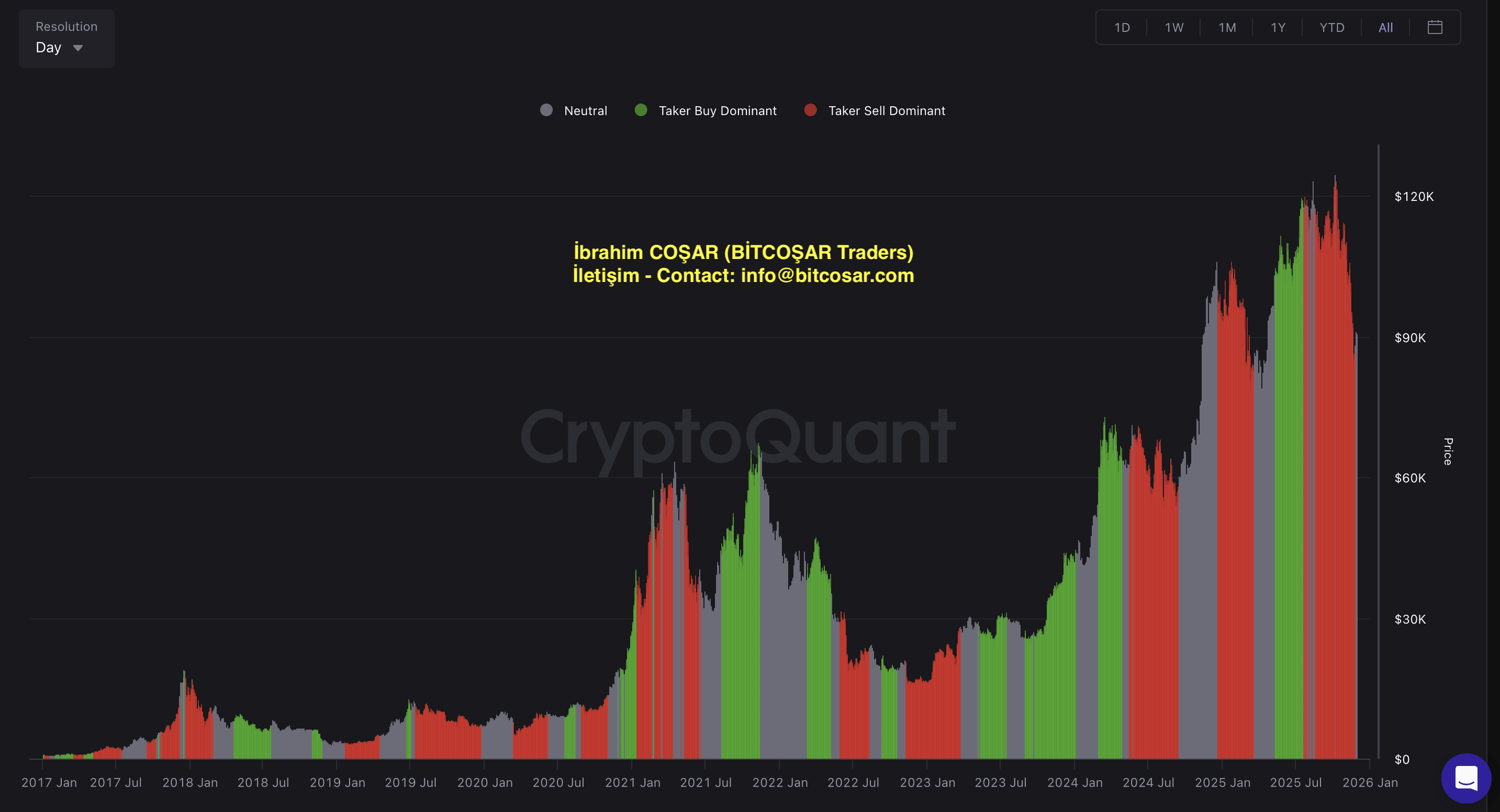 Graf CVD Spot Taker (90denní objem delta) se přesunul do NEUTRALNÍ ŠEDÉ FÁZE po historické vlně prodeje (Červená)!