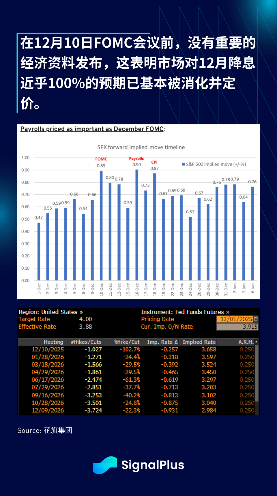Nejdůležitější ekonomické údaje v průběhu zbývajícího roku budou v následujících dvou týdnech: zasedání FOMC 10. prosince, následované zveřejněním údajů o nezaměstnanosti, které bylo odloženo na 16. prosince, a údaje o CPI 18. prosince. Kromě toho je třeba poznamenat, že od nynějška do data zasedání FOMC se prakticky žádné prvotřídní ekonomické údaje nezveřejní, a proto je trh téměř 100% přesvědčen o snížení sazeb, které bylo již téměř plně absorbováno (protože Fed obvykle nemá tendenci nechat trh očekávat překvapení), pozornost se zaměří na jazyk o směru politiky do roku 2026, nikoli na samotné rozhodnutí o sazbách.