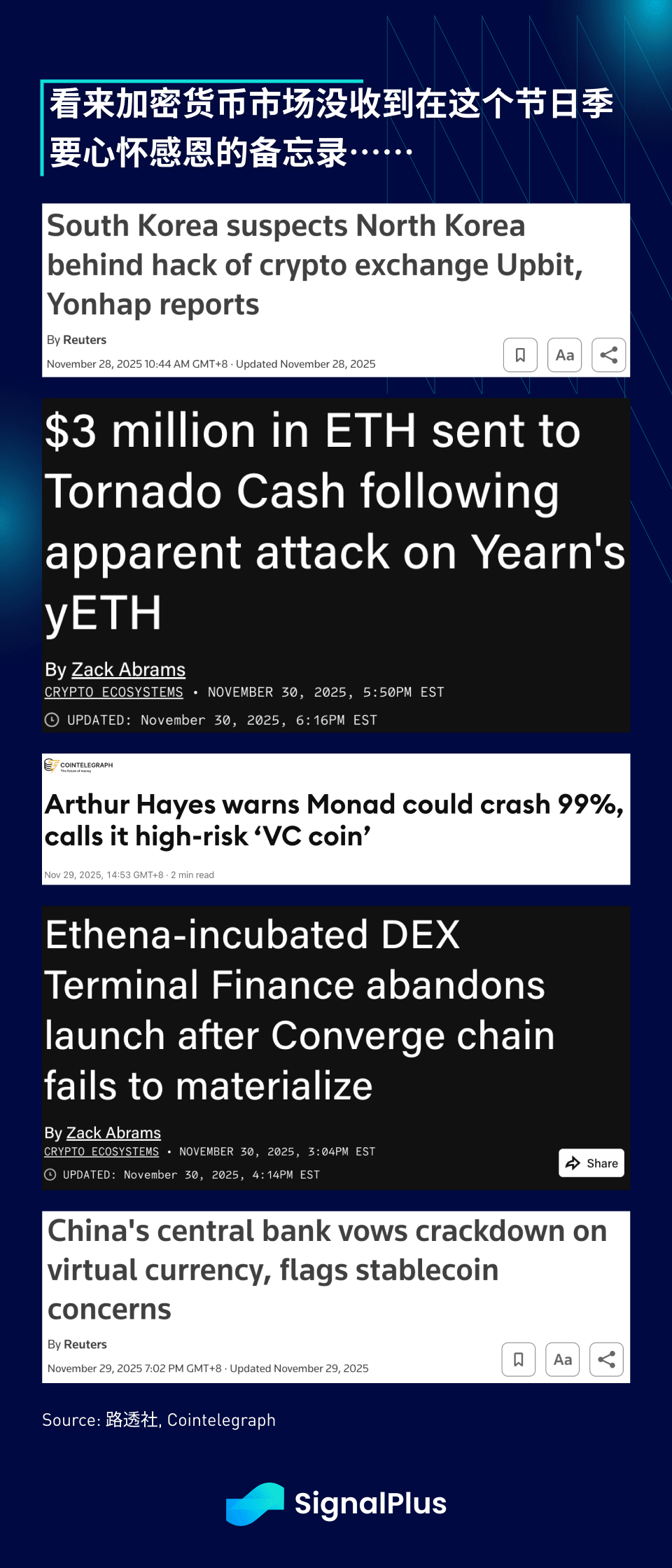 I když je těžké to přičítat jednomu jedinému faktoru, celková riziková averze zůstává slabá po trhu, který byl v říjnu a listopadu vyčištěn, a řada negativních titulků, které se objevily během posledních několika obchodních období, zhoršila pokles. Další DeFi projekt OG protokolu byl hacknut (Yearn staking), DEX terminál se vzdal očekávaného spuštění kvůli těžkým tržním podmínkám (Terminal Finance), OG Arthur Hayes veřejně “předpověděl” pokles nedávného Monad ICO (naznačuje 99% prostor pro pokles), Standard & Poor's snížil hodnocení USDT na “slabé” (nedostatečné informace) a čínská centrální banka znovu potvrdila opatrný přístup k obchodování s kryptoměnami a stablecoiny — celkově máme důvod se domnívat, že dokud nedostaneme další oznámení, stále pevně zůstáváme v medvědím trhu.