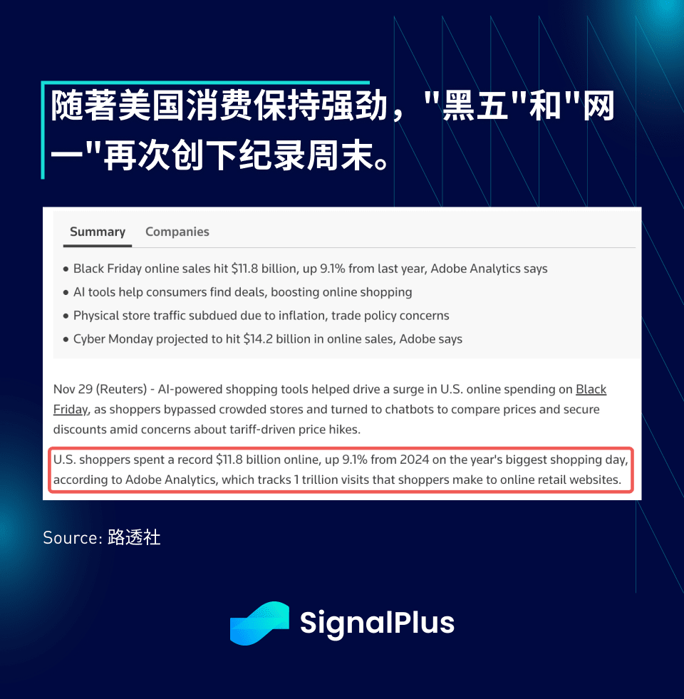 Kromě toho, první známky prodeje na Černý pátek naznačují, že jsme znovu překonali rekordy, online prodeje dosáhly téměř 12 miliard dolarů (meziroční nárůst o 9%) a Cyber Monday má přinést dalších 14 miliard dolarů příjmů. Dosud se zdá, že americká spotřeba zůstává silná.