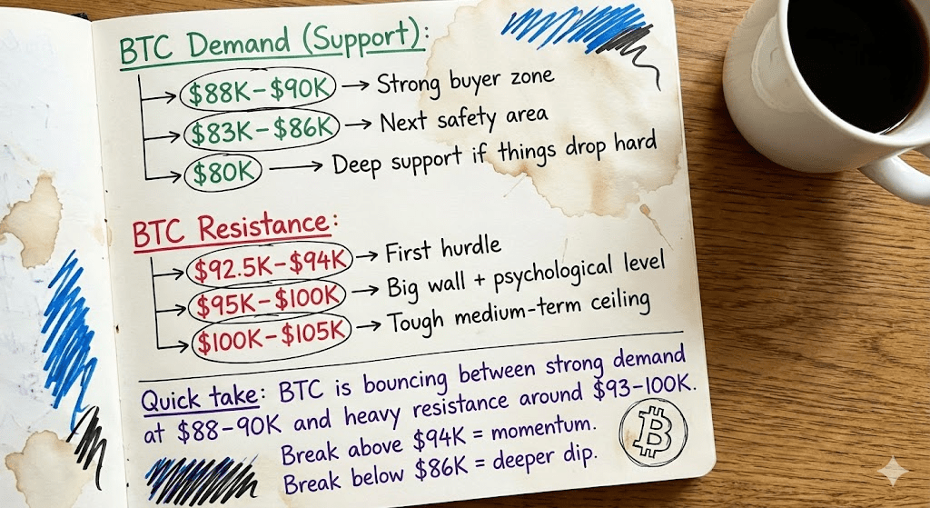 BTC se odrazuje mezi silnou poptávkou na úrovni 88–90 tis. USD a významným odporovým pásmem kolem 93–100 tis. USD. Průlom nad 94 tis. USD = dynamika. Průlom pod 86 tis. USD = hlubší pokles.
