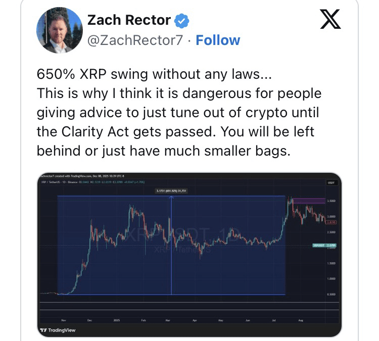 Po měsících konsolidace XRP opět prodloužil běh na vrchol $3.66 v červenci 2025. Podle Rectora to znamenalo 650% nárůst. Tržní analytik poukázal na to, že tento běh proběhl „bez jakýchkoli zákonů,“ což potvrzuje, že XRP již prokázal svou sklon k růstu v době, kdy Clarity Act nebyl přijat.