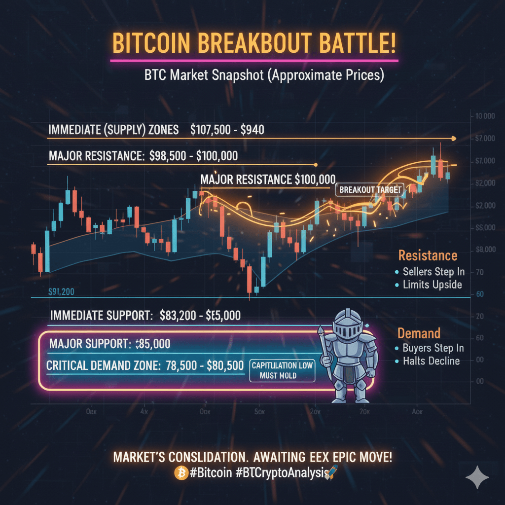 Na základě nedávné technické analýzy a pohybu cen je Bitcoin (BTC) momentálně v období konsolidace (obchodování na straně) v rámci zúženého rozpětí. Klíčem k dalšímu významnému pohybu bude rozhodující proražení nad rezistencí nebo jasné selhání v oblasti hlavní podpory (poptávka). Trh čeká na významný katalyzátor, jako je nadcházející zasedání Federálního výboru pro otevřený trh (FOMC), aby se dostal z tohoto úzkého rozpětí.