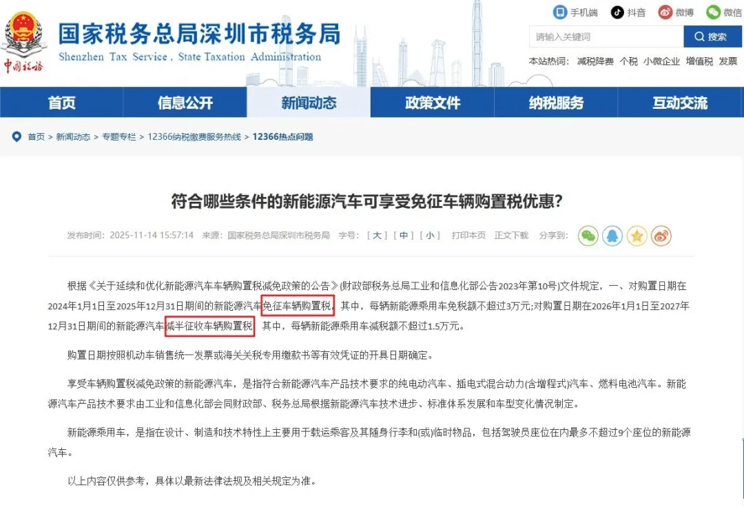🚗 Nové energetické vozy: Před zakoupením nového energetického vozu do 31. prosince 2025 se neplatí daň z koupě, od roku 2026 se sníží o polovinu. 100000 vozidel platí navíc 4425 RMB, 200000 vozidel navíc 8850 RMB, majitelé základních potřeb by neměli propásnout poslední okno (podle data vystavení faktury).