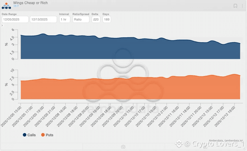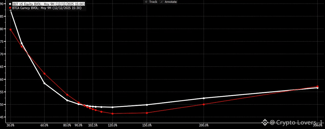Notice that IBIT’s call skew flipped positive (ie. upside calls are richer than ATM vol), whereas BTC skew remains negative (ie. upside calls are cheaper than ATM vol). In other words, IBIT has a volatility smile, but BTC does not.