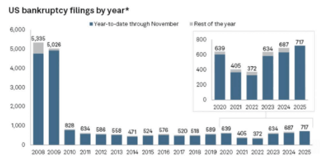 Korporátní stres ve Spojených státech se zintenzivňuje. V roce 2025 dosud podalo 717 velkých amerických společností návrh na bankrot, což je nejvyšší počet za posledních 15 let, již nad celkovým ročním počtem od roku 2010.