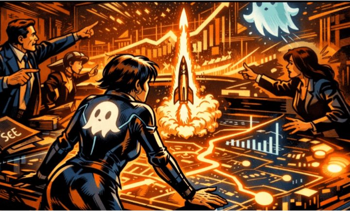 Futuristická válečná místnost se stratégem Aave, který vypouští raketu na digitální roadmapu 2026.