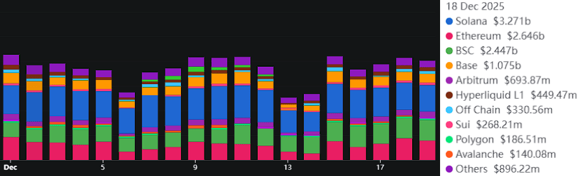 Nedávná data ukazují, že DEX založené na Solaně zaznamenaly 3.271 miliardy dolarů v obchodním objemu během tohoto období, což z ní činí nejvýkonnější řetězec podle aktivity DEX. Ethereum ($ETH) následovalo na druhém místě s objemem 2.646 miliardy dolarů.