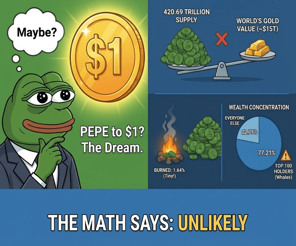Matematika: V současnosti existuje 420,69 bilionu tokenů PEPE. Aby jeden token měl hodnotu $1, musela by tržní kapitalizace (celková hodnota) dosáhnout $420,69 bilionu.