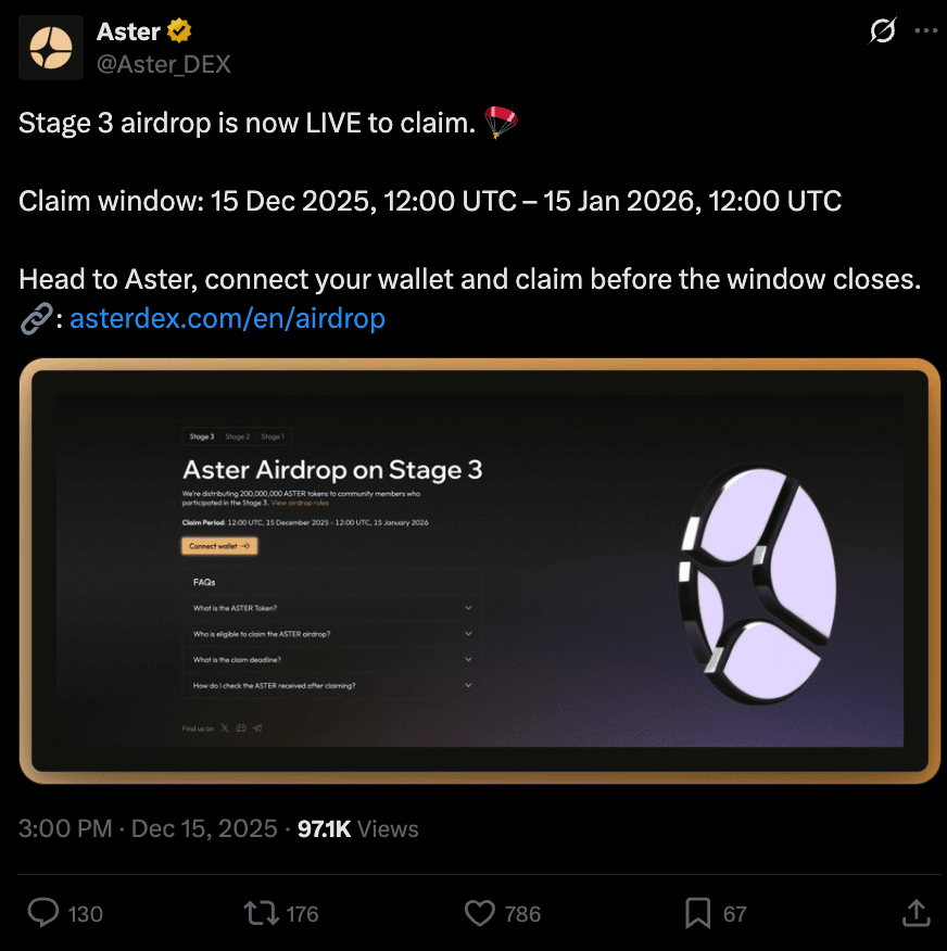 ASTER Stupeň 3 Airdrop Okno pro Uplatnění Otevřeno: Aster otevřel své okno pro uplatnění airdropu stupně 3 15. prosince 2025 (běží do 15. ledna 2026). S ASTER již v top-10 BEP-20, je to klíčová distribuční událost, kterou je třeba sledovat pro změny nabídky/poptávky.