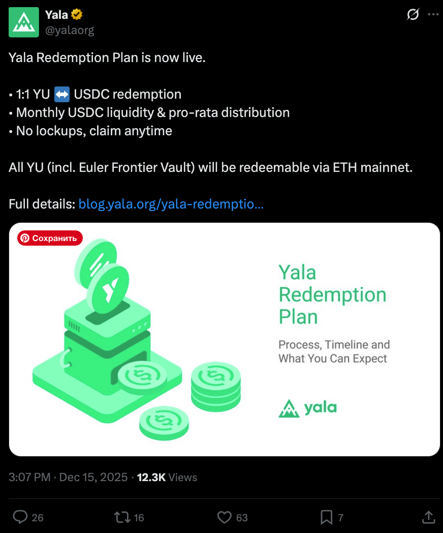 Yalaův plán na odkup je spuštěn (YU ↔ USDC): Yala spustil svůj plán na odkup, umožňující 1:1 YU ↔ USDC odkupy s měsíční likviditou a pro-rata distribučními mechanikami, což jej umisťuje jako krok k obnovení důvěry po předchozím stresu likvidity.