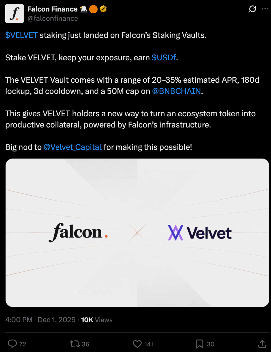 Falcon spouští stakování VELVET (USDf výnos na BNB Chain): Falcon Finance zavedl stakovací vault VELVET na BNB Chain, což umožňuje držitelům udržovat exponenciální zisky při získávání odhadovaných 20–35 % APR vyplácených v USDf (180denní zámek, 3denní ochlazení, 50M VELVET strop).