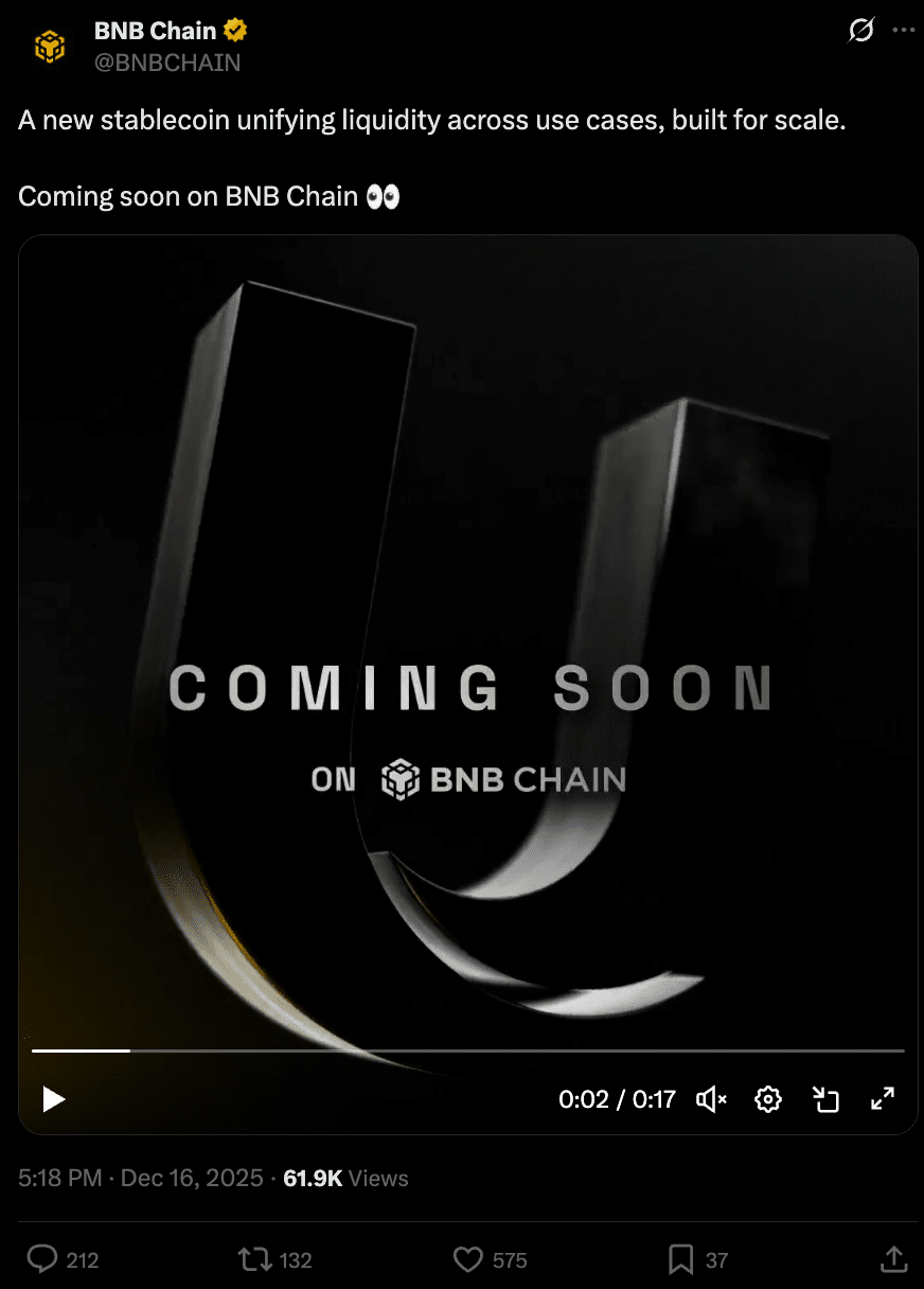 BNB Chain naznačuje, že přichází nová stablecoin: BNB Chain naznačil nadcházející iniciativu stablecoinu, která má za cíl podpořit "liquiditu nové generace" a velké on-chain aktivity. Podrobnosti jsou zatím skromné, ale toto je něco, co je třeba sledovat, pokud to souvisí s platbami, DeFi likviditou nebo pobídkami v ekosystému.